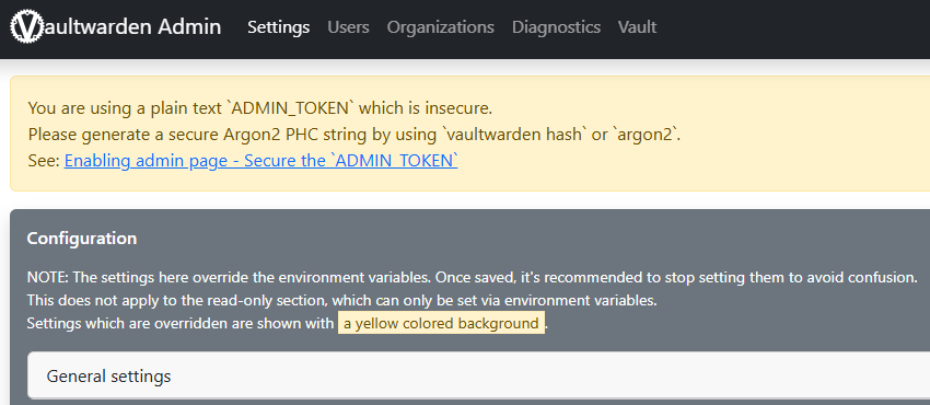 En el primer acceso nos advierte de `ADMIN_TOKEN` inseguro que cambiaremos siguiendo: Enabling admin page · dani-garcia/vaultwarden Wiki · GitHub