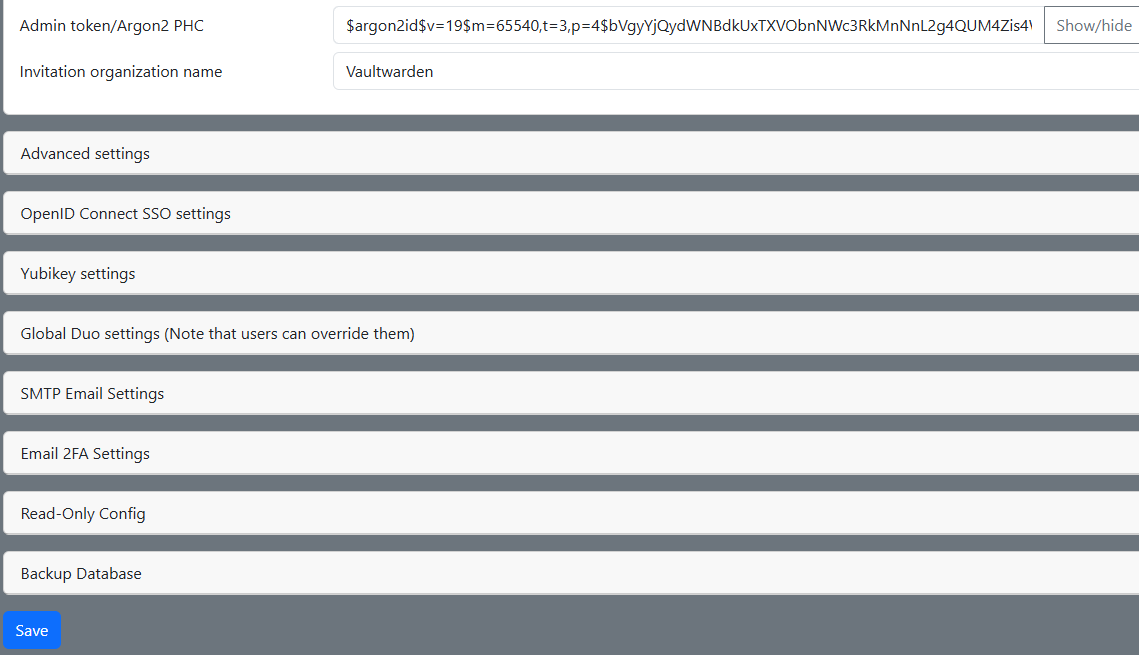 https://vaultwarden.dominio.com/admin para hacer cambios en la configuración. Usa el admin Token